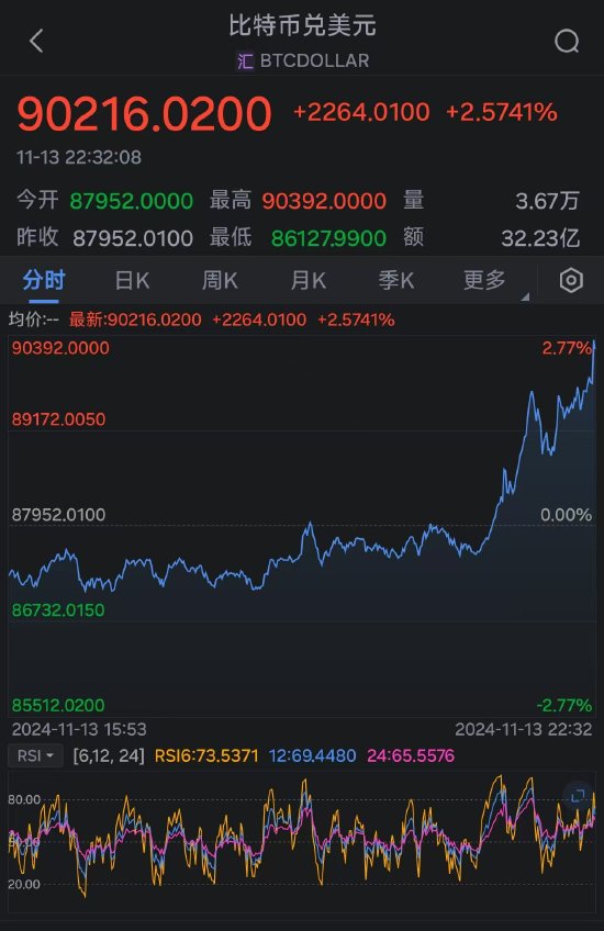比特币首次突破90000美元大关 年内价格翻倍