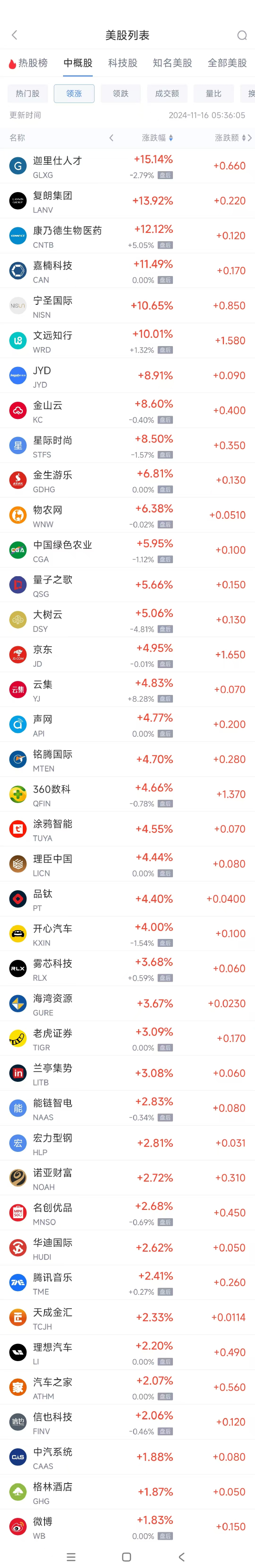 上涨股当中(按市值降序排列),拼多多涨1.49%,网易涨1.51%,京东涨4.95%,百度涨0.62%,中华电信涨0.67%,理想汽车涨2.20%,贝壳涨0.83%,腾讯音乐涨2.41%,中通涨0.72%,富途控股涨0.45%,小鹏汽车涨0.87%,华住酒店集团涨1.27%,蔚来涨1.35%,新东方涨1.54%,满帮涨0.85%,WSP控股涨0.10%,名创优品涨2.68%,文远知行涨10.01%,360数科涨4.66%,汽车之家涨2.07%。