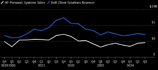 戴尔的个人电脑业务第三财季营收下降1%,至121亿美元,不及预期。惠普的个人电脑业务三个月营收增长2%,至95.9亿美元,也逊于分析师的平均预期。