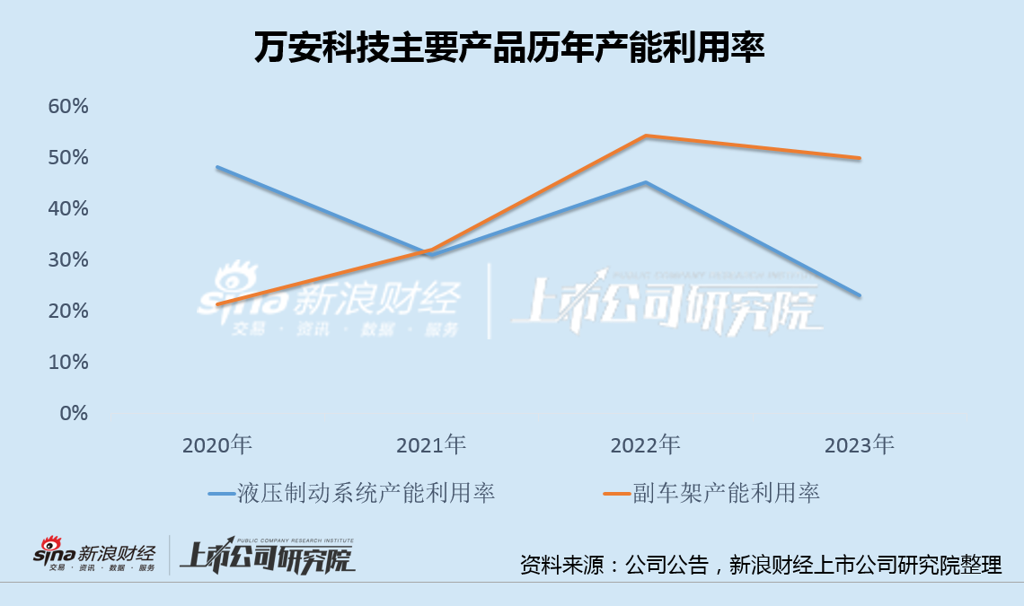 然而经统计发现,随着产能的不断扩张,万安科技液压制动系统和副车架两大产品近年来的产能利用率,持续在50%以下的低位徘徊,特别是液压制动系统,产能利用率从2020年的约50%下滑到了2023年的20%左右。