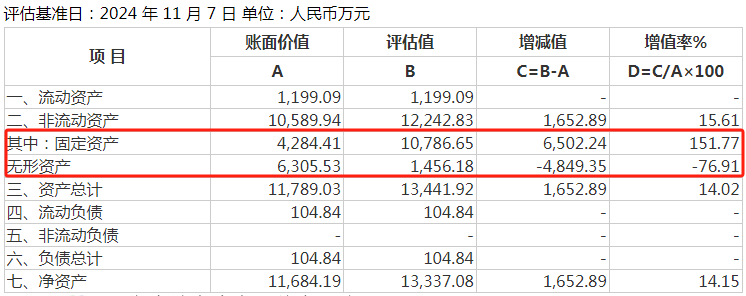 另外,以房屋建筑为主的固定资产评估增值152%,同时以土地使用权为主的无形资产评估减值77%,评估值与原值之间存在显著差异,原因也不得而知。