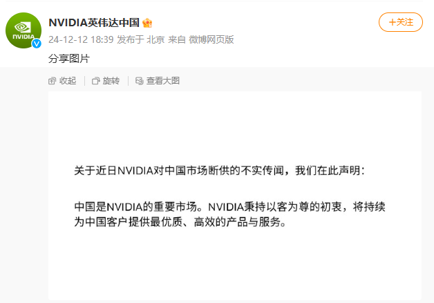 12月12日消息,英伟达中国官方微博发声明,称近日社交媒体上传英伟达断供中国为不实传闻。公司表示,中国是NVIDIA重要的市场,未来将持续为中国客户提供高质量服务。