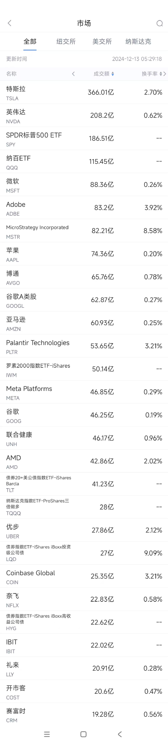 12月12日美股成交额前20:Adobe业绩欠佳股价重挫13.7%