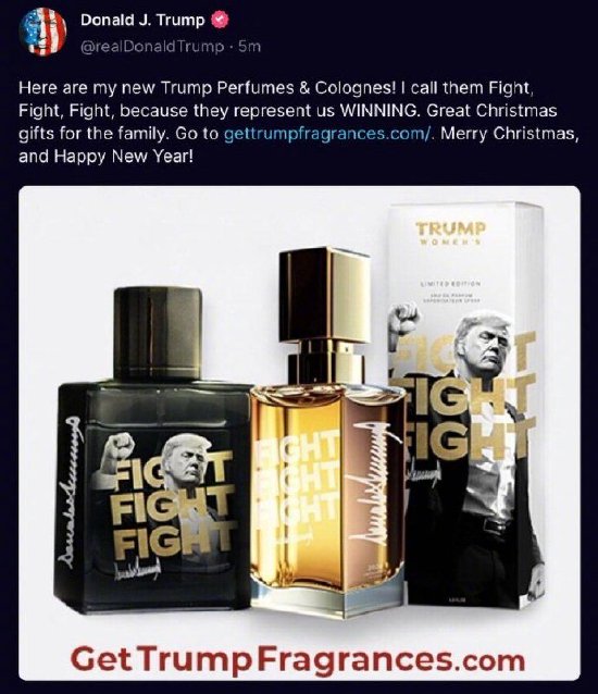 先前据报道,特朗普7日在Truth Social上发文,推出以“特朗普香水和古龙水”为品牌的全新香水系列。该系列以“战斗,战斗,战斗”为名。特朗普写道: “这是我的新特朗普香水和古龙水!我把它们称为战斗、战斗、战斗,因为它们代表着我们的胜利。这是送给家人的很棒的圣诞礼物。”