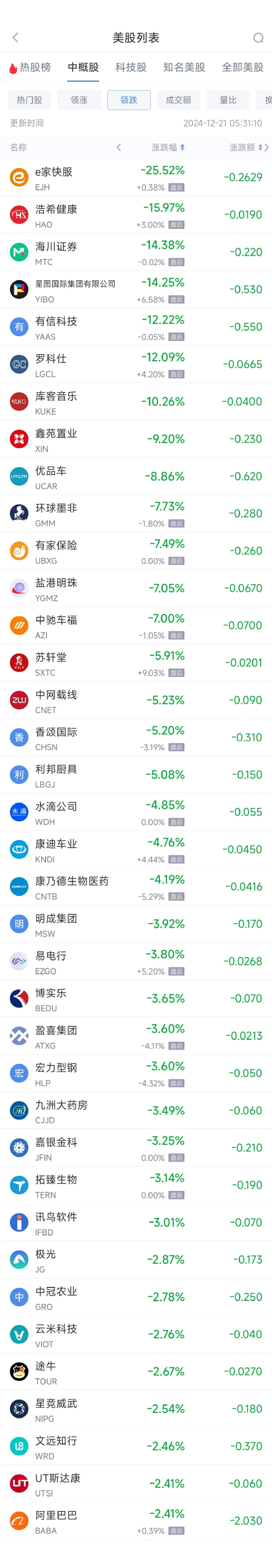 领跌中概股列表: