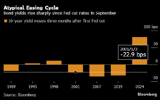 自央行主事者9月开始削减基准利率以来,美国10年期国债收益率已升逾0.75个百分点。这是一种违反直觉、会导致损失的反应,创下1989年以来降息周期头三个月内的最大上涨。