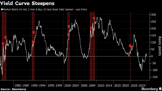 上周,美国10年期国债收益率一度比2年期国债收益率高出0.25个百分点,创下2022年以来的最大差距。周五的数据显示,美联储偏好的通胀指标11月的升速创下5月以来最慢,该收益率差缩小。