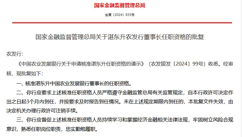湛东升任农发行董事长获核准