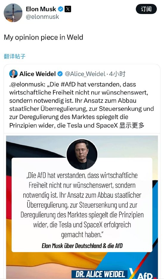 这位亿万富翁在周六发表的评论中写道:“尽管 AfD 被描述为极右翼,但它代表了一种政治现实主义,引起了许多德国人的共鸣,他们觉得自己的担忧被当权者忽视了。它解决了当今的问题——没有经常掩盖真相的政治正确性。”