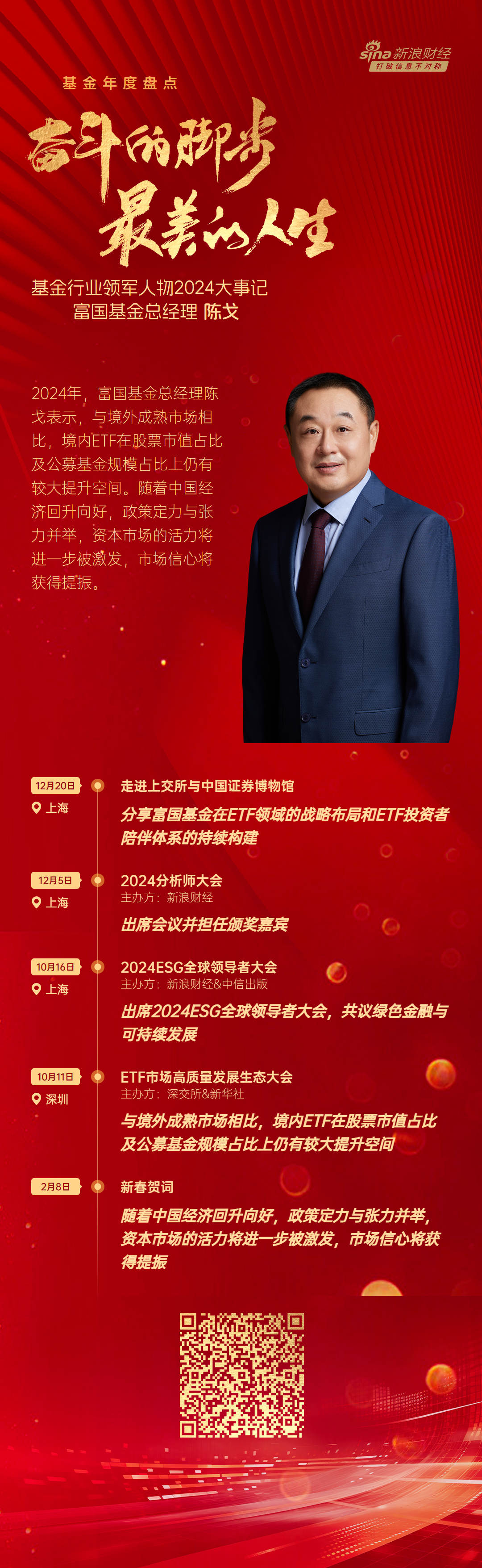 岁末年初,新浪财经推出基金年度盘点——行业领军人物2024大事记。2024年,富国基金总经理陈戈表示,与境外成熟市场相比,境内ETF在股票市值占比及公募基金规模占比上仍有较大提升空间。随着中国经济回升向好,政策定力与张力并举,资本市场的活力将进一步被激发,市场信心将获得提振。