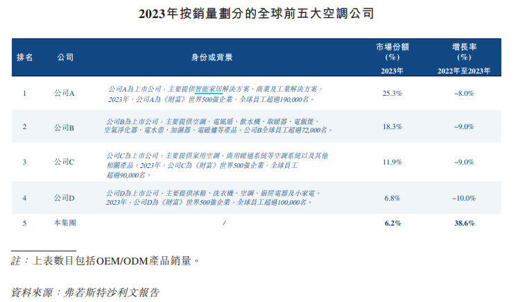 而根据弗若斯特沙利文的数据,按2023年销量计,奥克斯电气是全球第五大空调公司,市场份额为6.2%。排在前列的4家公司全部为上市公司,2023年市场份额分别为25.3%、18.3%、11.9%、6.8%,尽管2023年增长率纷纷有所减少,但合计占比超过62%。对比之下,奥克斯电气的市场份额并不算高,相比头部公司仍存在着较大差距。