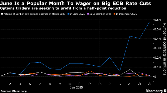 数据显示,交易员的押注主要集中在与6月到期的3个月期Euribor融资利率挂钩的期权上,此番押注自今年年初以迅速累积。