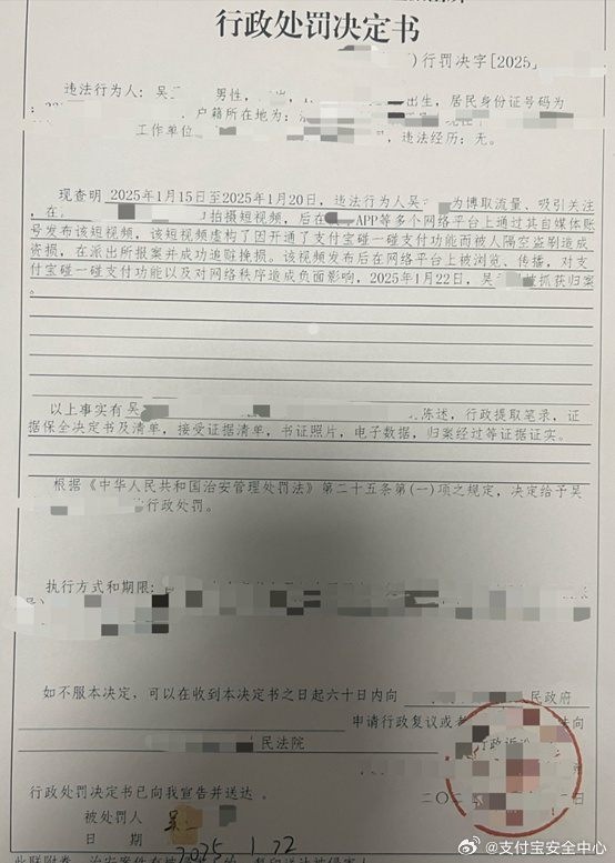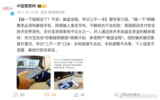 1月23日金融一线消息,支付宝安全中心微博今日发文称,近期,部分自媒体为吸引眼球和流量,发布摆拍虚假视频,捏造“使用支付宝碰一下钱被隔空盗刷”等不实内容。经公安机关依法办案,部分造谣者已受到应有的惩处。