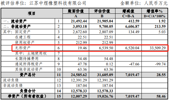 评估报告显示,按照资产基础法,江苏中煜净资产账面价值为12007.29万元,净资产评估价值为19026.76万元,增值率为58.46%。其中,无形资产评估价值为6539.50万元,增值率高达33509%。