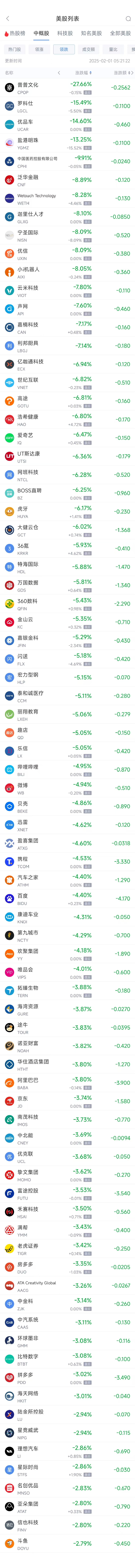 下跌股当中(按市值降序排列),阿里巴巴跌3.81%,拼多多跌3.02%,网易跌1.94%,京东跌3.74%,携程跌4.54%,百度跌4.40%,理想汽车跌2.86%,贝壳跌4.91%,腾讯音乐跌2.40%,中通跌2.25%,联电跌0.94%,小鹏汽车跌2.28%,富途控股跌3.53%,满帮跌3.54%,中国新城农村跌2.19%,华住酒店集团跌3.80%,蔚来跌2.48%,新东方跌1.08%,唯品会跌4.03%,名创优品跌2.92%,哔哩哔哩跌4.95%,极氪跌1.14%,BOSS直聘跌6.25%,360数科跌5.43%,小马智行跌2.01%,万国数据跌5.81%,文远知行跌0.74%,亚朵集团跌2.80%,汽车之家跌4.40%,金山云跌5.35%,雾芯科技跌0.23%。