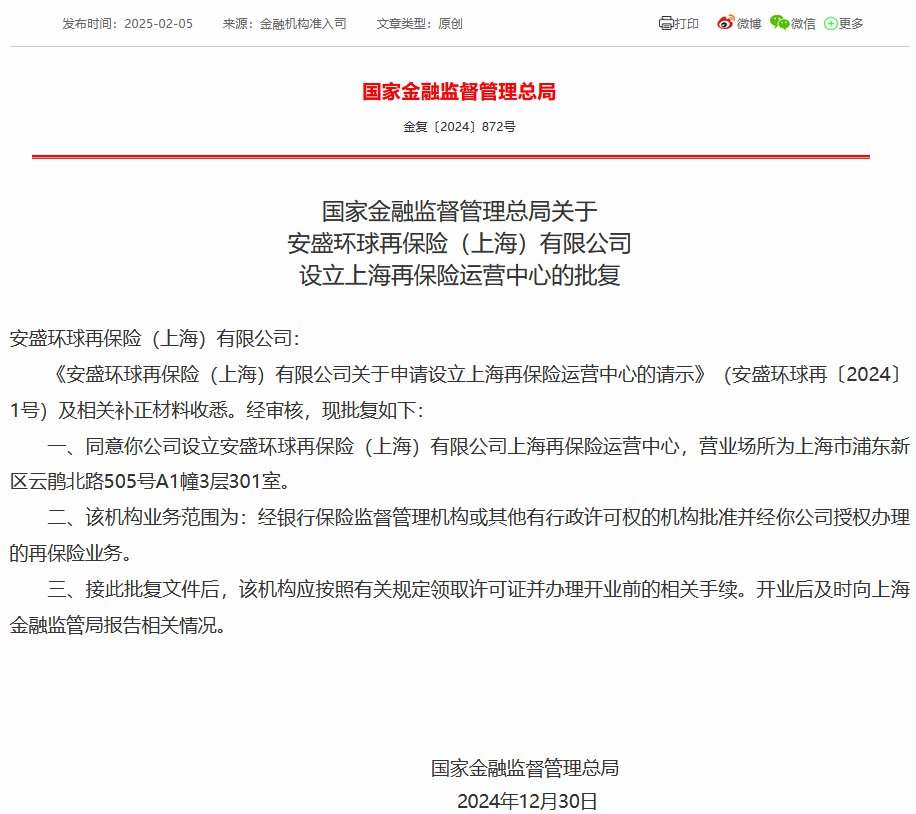 2月5日金融一线消息,国家金融监督管理总局今日发布关于安盛环球再保险(上海)有限公司设立上海再保险运营中心的批复,同意该公司设立安盛环球再保险(上海)有限公司上海再保险运营中心,营业场所为上海市浦东新区云鹃北路505号A1幢3层301室。