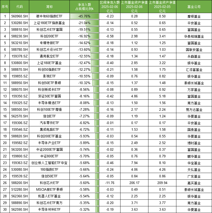 最不受欢迎ETF:2月6日摩根碳中和60指数ETF一天被赎回超45%,平安上证180ETF一天被赎回2成(附名单)