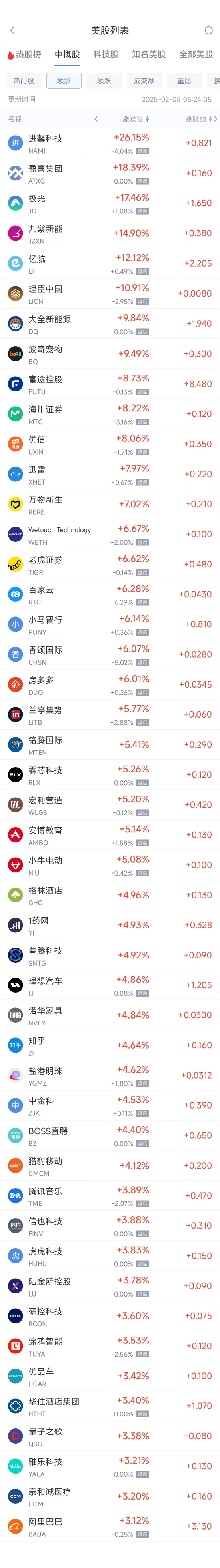 上涨股当中(按市值降序排列),阿里巴巴涨3.12%,拼多多涨1.38%,网易涨0.94%,京东涨0.40%,携程涨1.01%,百度涨0.57%,理想汽车涨4.86%,日月光半导体涨0.10%,贝壳涨0.34%,腾讯音乐涨3.89%,中通涨0.68%,富途控股涨8.73%,满帮涨2.61%,华住酒店集团涨3.40%,蔚来涨0.95%,WSP控股涨0.77%,新东方涨0.17%,哔哩哔哩涨2.49%,名创优品涨1.14%,BOSS直聘涨4.40%,360数科涨1.15%,万国数据涨2.73%,小马智行涨6.14%,文远知行涨0.06%。