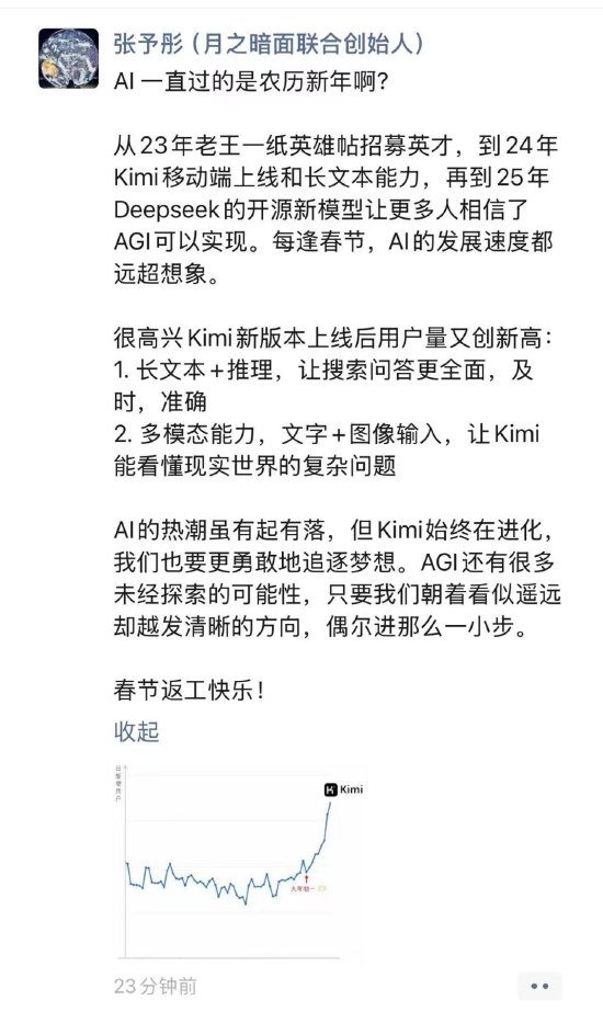 同时,她还配了张Kimi用户量的图示。该图显示,从大年初一起,Kimi的用户量持续飙升。