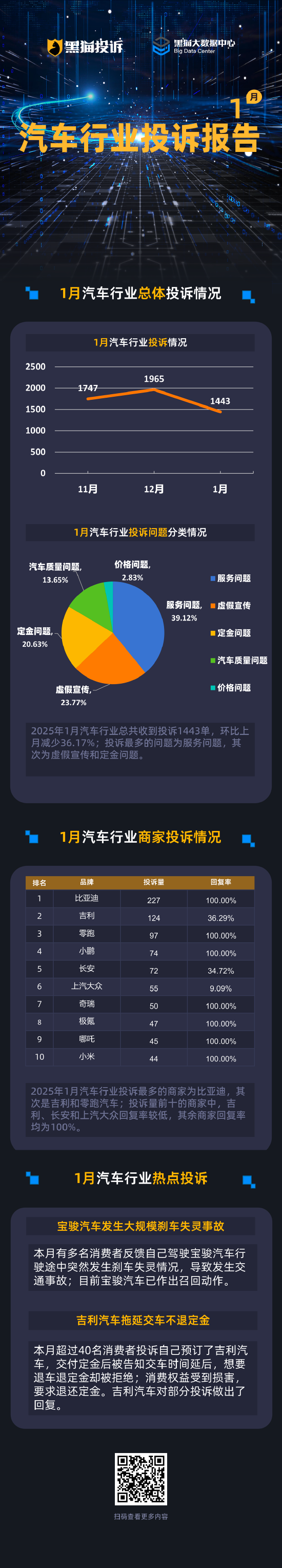 黑猫大数据中心发布黑猫1月汽车投诉报告。1月汽车行业收到投诉1443单,环比上月减少36.17%,主要投诉问题为服务问题、虚假宣传和定金问题;吉利、长安和上汽大众回复率较低;宝骏发生大规模刹车失灵事故,吉利汽车拖延交车不退定金。