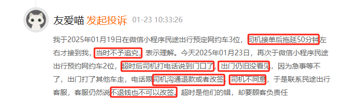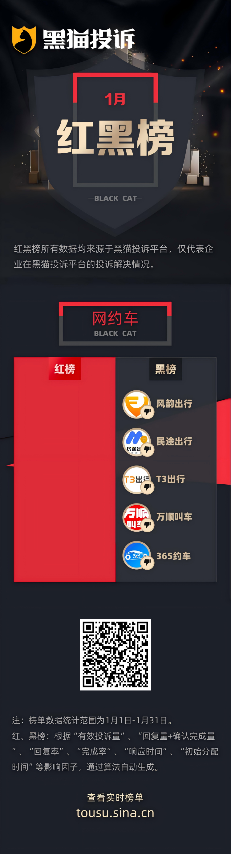 1月黑猫投诉企业红黑榜:民途出行司机爽约拒不退款