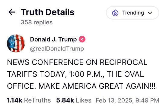 美国总统特朗普在Truth Social发帖宣布,他将于周四下午1:00(北京时间2月14日凌晨2:00)就对等关税问题举行新闻发布会。
