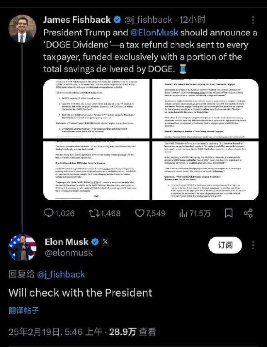 美国投资公司Azoria的CEO詹姆斯·费什巴克(James Fishback)在X上发帖称,特朗普和马斯克应该宣布一项“DOGE红利”——一张发给每个纳税人的退税支票,用DOGE节省下来的政府预算的一部分来提供资金。