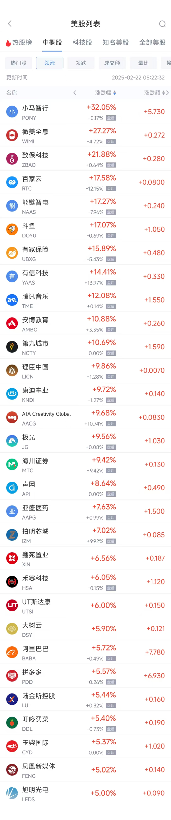 上涨股当中(按市值降序排列),阿里巴巴涨5.68%,拼多多涨5.57%,网易涨1.77%,京东涨2.99%,携程涨1.38%,百度涨1.82%,中华电信涨0.49%,理想汽车涨4.13%,贝壳涨3.34%,腾讯音乐涨12.20%,小鹏汽车涨4.12%,富途控股涨0.67%,中通涨0.92%,哔哩哔哩涨3.21%,蔚来涨1.72%,小马智行涨32.05%,唯品会涨1.44%,BOSS直聘涨2.30%,极氪涨0.04%。