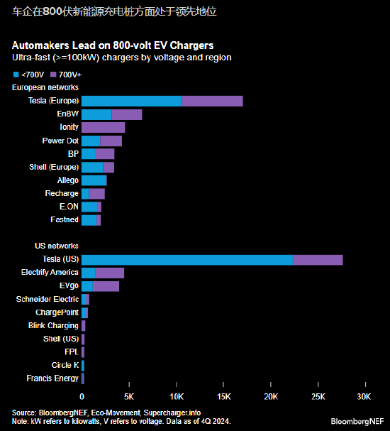 特斯拉和Ionity(一家由车企支持的合资企业)就在欧洲800伏充电桩中占到20%的份额。美国的情况也类似,特斯拉和Electrify America(大众汽车的充电网络)处于领先地位。根据分析,Electrify America在2024年将其网络中800伏充电桩的数量增加了60%。