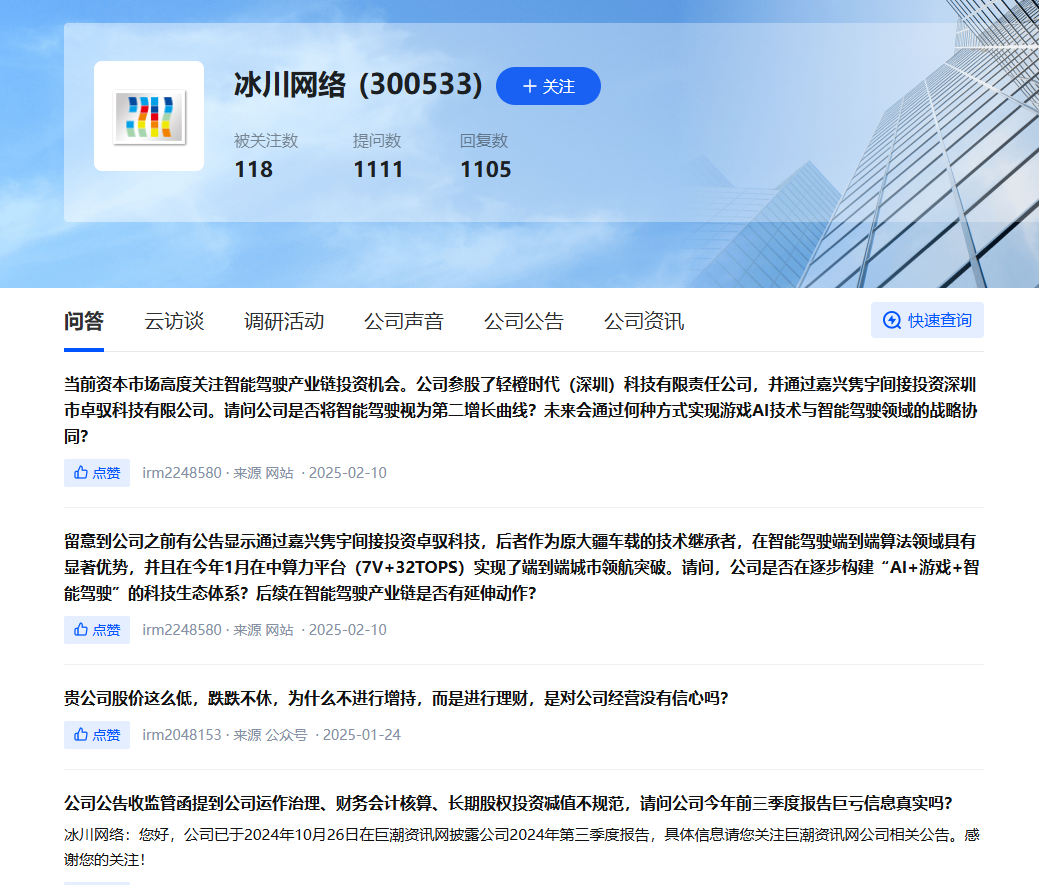 此外,今年1月以来,投资者在深交所互动易上的多条提问,目前仍未获冰川网络回复。