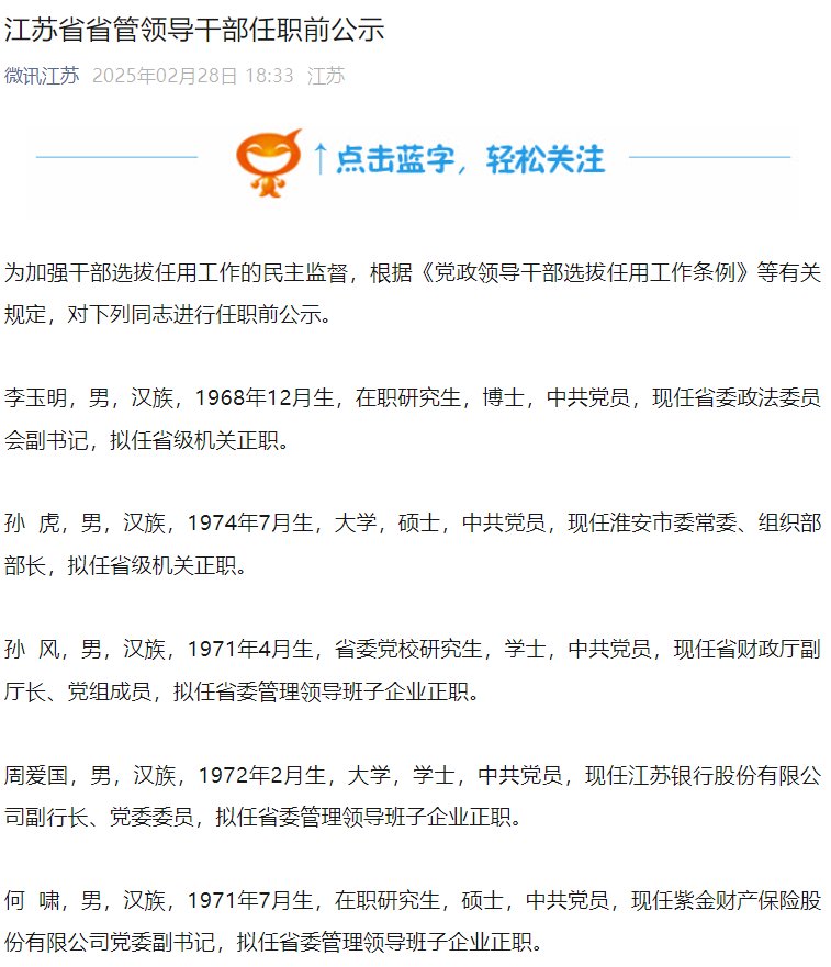 2月28日金融一线消息,据中共江苏省委组织部发布的江苏省省管领导干部任职前公示,现任江苏银行副行长、党委委员周爱国拟任省委管理领导班子企业正职。