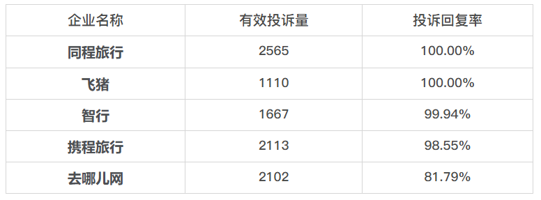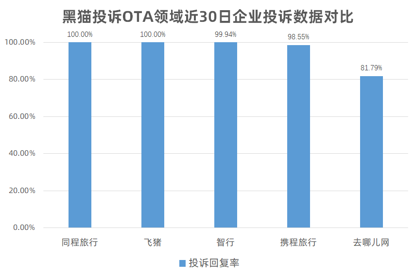 黑猫投诉OTA领域近30日投诉数据对比:去哪儿网回复率仅8成